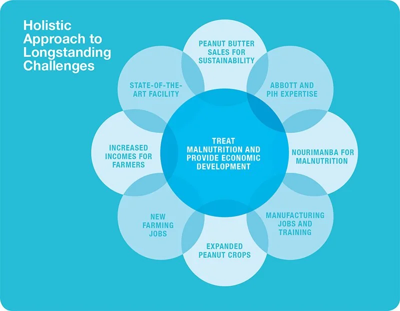 The partnership has built and opened a new facility operated by Haitians to produce Nourimanba, PIH's free and life-giving treatment for severe malnutrition in children. The partnership's agricultural development program also is helping local farmers supply the facility with high-quality peanuts while raising farmers’ incomes. Today, the facility concentrates on producing Nourimanba and is assessing options to produce fortified peanut butter that can be sold in Haiti. They seek to create a self-sustaining social enterprise that supports facility operations and helps drive local economic activity.