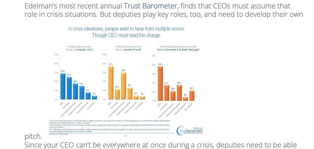 Edelman’s most recent annual Trust Barometer, finds that CEOs must assume that role in crisis situations. But deputies play key roles, too, and need to develop their own pitch.
